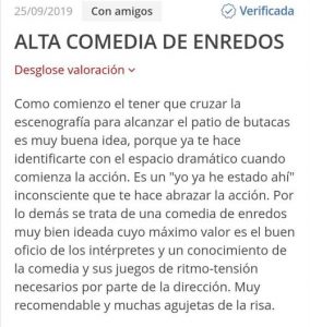 Como bien dice Luis Muñoz en la Revista Tarántula, «una acertada dirección de Darío Frías y la trepidante actuación de Veki Velilla, Carlota Baró, Edu Rejón y Gonzalo Trujillo, que no escatiman en resortes para hacer que el público ría con ganas, para eso hace falta que se conjuren varios talentos y en este caso autor, director y actores lo logran»