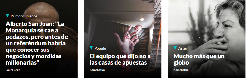 Esta es la landing de Kamchatka, a la izquierda Animalario (Alberto San Juan) argumenta que la monarquía se cae a pedazos, y justo a la derecha Animalario (Roberto Álamo) recibe un enorme rapapolvo por su participación en un anuncio de apuestas: claro que lo recibe de un modo muy indirecto y sin ser mencionado, apuntando a Cristiano Ronaldo o a Carlos Sobera, pero muy inteligentemente dirigido a Roberto. Y por último a la derecha del todo, de nuevo de un modo sutil (tan sutil que en realidad no es eso) Kamchatka se queja de que Animalario no haya dedicado un monográfico a Gloria Fuertes. Es como si el “algoritmo” hubiera sufrido una enorme neurosis cognitiva, y decidido en una sola portada mostrar simultáneamente el aleph y el nirvana: por eso, pasear por esa remota península de la antigua U.R.S.S. es edificante, se haga desde el punto de vista que se haga.