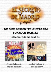El secreto de Madrid es una alternativa de ocio muy original. Tienen dos juegos de escape exteriores ambientados en el cine y en la música de los 80 y también tienen otro juego de escape a domicilio. Es perfecto para jugar con tu familia o grupo de amigos. Al aire libre y divertidísimo!