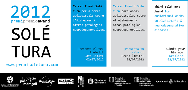 Ya hemos colgado la bases de la tercera edición del III premio Solé Tura de audiovisuales sobre el Alzheimer y otras enfermedades neurodegenerativas. El concurso está abierto a obras de cualquier duración y género, ficción o documental, que aborde el tema desde una perspectiva artística, conceptual o científica. El éxito de las dos primeras convocatorias nos anima a querer convertirlo en un referente internacional en su género. Pensamos que el cine es una herramienta magnífica para sensibilizar a la población, sobretodo a la más joven, sobre el alcance de estas enfermedades. Además, queremos que la cuantía y la difusión del premio sirvan para estimular el talento en la creación audiovisual. El galardón entrega premios de 3.000, 1.500 y 500 euros, respectivamente, a las 3 obras ganadoras, además de darles la máxima visibilidad.